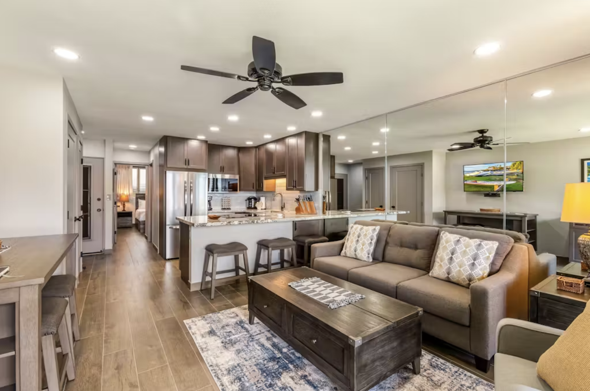 Boasting a slew of renovations, this condo has all you need to easily relax during your island vacation. The spacious living area provides ample room to comfortably lounge while watching something on the TV. Grab a drink from the nearby dry bar or have the group chef prepare something in the well-equipped kitchen for everyone to enjoy. Indulge inside or take it to the furnished patio and dine alfresco while admiring the picturesque backdrop. Couples will love the primary suite and its inclusions. Featuring plush bedding and a TV to enjoy as you lie down, its en suite is equipped with dual vanity sinks for added comfort and a roomy walk-in shower. Wake up every morning with a fresh cup of coffee and a refreshing dip in the pool.